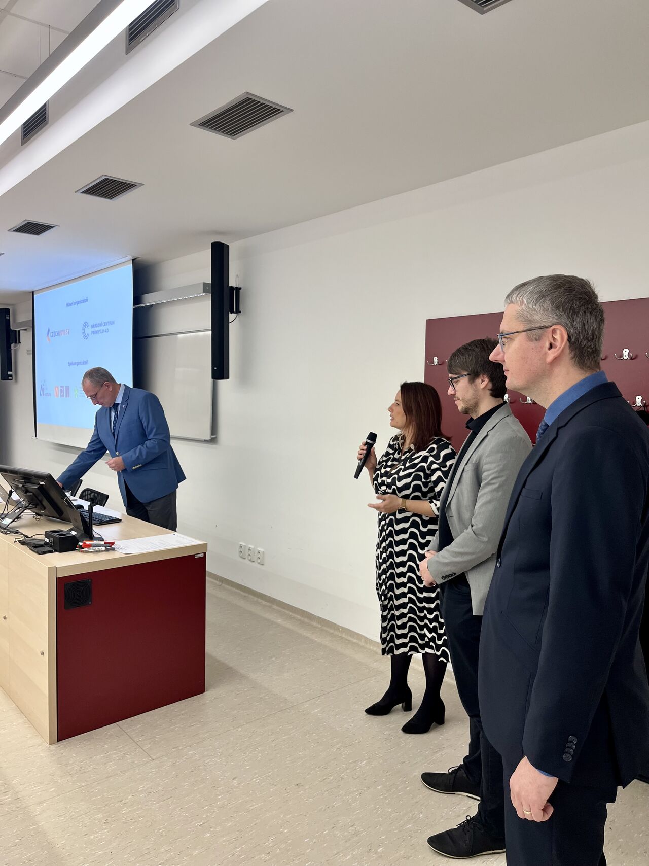 Akci zahájili zástupci pořádajících institucí — Robert Keil (Národní centrum Průmyslu 4.0), Lucie Tomandlová (CzechInvest) a doc. RNDr. Petr Bartoš, Ph.D. (FZT JU).