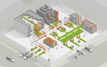 Ukázka vzorového skladu splňujícího požadavky na automatizaci logistiky. Jsou zde patrny: systémy pro zaskladnění palet a boxů, škálovatelné až po malé či lokální automaty; zařízení pro automatickou manipulaci, ať již s pevnou dráhou (dopravníky, monorail), nebo s volným pohybem (autonomní manipulační technika); robotická pracoviště pro práci s paletami i boxy a automatické třídicí systémy podpořené automatickou identifikací materiálu. To vše spojeno v datové kostce poskytující přehled o dění ve skladu v reálném čase. Vizualizace: Logio