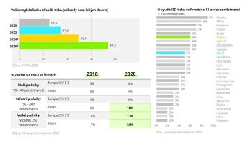 Aditivní výrobu v České republice najdeme převážně ve velkých podnicích (nad 250 zaměstnanců), kde ji ke své činnosti využívá 26 % podniků. U středně velkých podniků (50–249) je tento podíl 10 % a vůbec nejmenší využití má 3D tisk v malých podnicích (10–49 zaměstnanců), kterých v roce 2020 využívalo aditivní výrobu pouze 4 %. Ačkoli je Česká republika obecně malým hráčem na trhu, nárůst použití aditivních technologií jí a jejím firmám napomáhá k vyšší konkurenceschopnosti. Nicméně spousta firem zatím stále váhá a řada z nich neví, jak maximální potenciál této technologie využít. Na základě dostupných statistik se zdá, že 80 % podniků, které s technologií pracují, ji používá pro vývoj malých modelů a prototypů pro interní potřeby a pouze třetina z nich pro výrobu modelů určených k prodeji. Proč by se měly podniky o aditivní výrobu více zajímat?