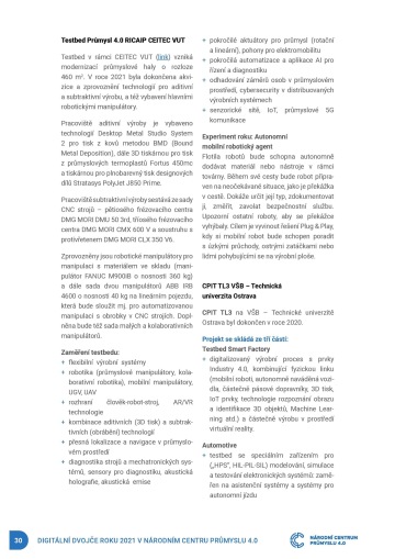 Centrum se za roky svého působení stalo nejenom autoritou v oblasti Průmyslu 4.0, která aktivně komunikuje se státem či médii, propojuje akademii s průmyslem, ale nabízí také široké portfolio služeb především pro malé a střední podniky. Digitální audit si již řada firem vyzkoušela a my teď připravujeme i srovnávací analýzu z našich zjištění, aktivně se podílíme na vzdělávání odborné i široké veřejnosti, měříme “digitální apetit a náladu” v českých průmyslových firmách v našich průzkumech a zapojujeme se do evropských projektů podporujících digitalizaci malých a středních firem.