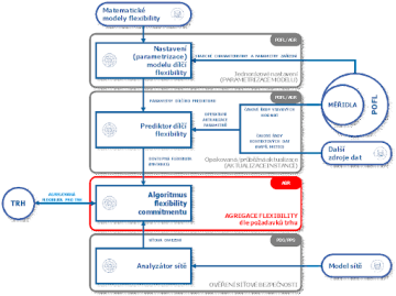 Nejprve je třeba analyzovat chování Poskytovatele flexibility (POFL), resp. technologie, kterými je vybaven, a zvolit vhodný obecný matematický model, kterým bude dostupná flexibilita modelována (např. tepelné čerpadlo, HVAC). Obecný model je následně nastaven dle konkrétních parametrů technologie. S využitím aktuálních hodnot o stavu technologie, případně dalších hodnot, které model vyžaduje, je průběžně poskytována predikce dostupného flexibilního výkonu pro konkrétního POFLa (tzv. instance).