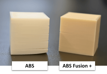 Doplním ještě jeden postřeh z našeho měření. Pro testování jsme porovnávali i klasické ABS a ABS Fusion +, jenž je speciálně modifikované, aby bylo méně náchylné na deformaci a praskání v otevřených tiskárnách. Tuto vlastnost materiálu ABS Fusion + jsme si ověřili tiskem kvádrů o základně 4 x 4 cm a výplní 30 %. Na obrázku můžete vidět, že klasické ABS vykazuje mnohem větší deformaci a praskání než ABS Fusion+.