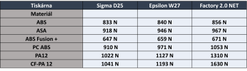 V níže uvedeném přehledu pak můžete vidět, které materiály jsme testovali. Po vytištění jsme všechny vzorky z daných materiálů podrobili trhacím testům. Průměrné hodnoty, které byly pro přetržení třeba, jsou přesně uvedené v porovnávací tabulce.