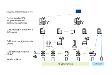 - Centrální C-ITS stanice, tzv. C-ITS Back Office, zajišťující generování, distribuci, zpracování a vyhodnocení dopravních událostí