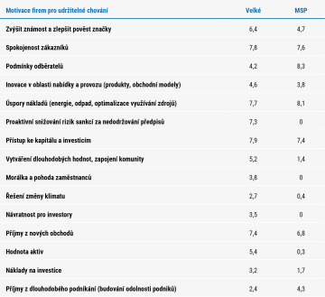 Pro velké firmy je, kromě úspory nákladů, velkým motivátorem i vidina nových obchodních příležitostí (7,4 bodu). Oproti malým a středním podnikům mají zejména zahraniční korporace zakotvené dodržování podmínek udržitelnosti ve svých dlouhodobých globálních strategiích a od toho se odvíjí jejich další priority, jak je znázorněno v tabulce výše.