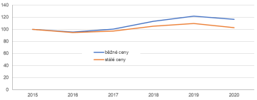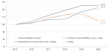 Vývoj tržeb v sektorech české ekonomiky (2015 = 100)