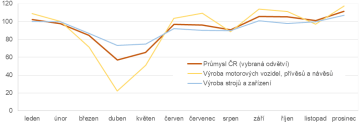 Hodnota nových zakázek v průmyslu se v dubnu 2020 propadla o více než 40 %, v automobilovém průmyslu dokonce o téměř 80 %. Příslibem vývoje průmyslu v letošním roce je hodnota nových průmyslových zakázek v posledních měsících roku 2020 – od září se již pohybuje nad úrovní roku 2019.