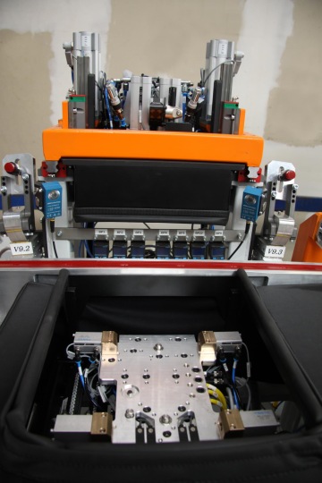 Základem pracoviště je montážní stůl tvořený zmíněným kopytem neboli přípravkem, do kterého se usazuje lišta lepená na sklo a pomocí podtlakové přísavné lišty přichytí. Stůl stojí vedle pásového dopravníku, ze kterého si každé sklo pomocí přísavek uchopí podávací rameno.