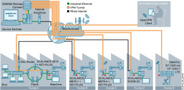 Připojení k SINEMA Remote Connect je možné pomocí bezdrátové komunikace, DSL nebo existujících struktur místní privátní sítě. Pro připojení ke vzdáleným sítím lze využít také široké portfolio průmyslových routerů SCALANCE od společnosti Siemens (viz níže).