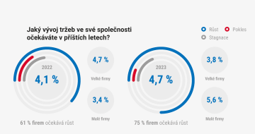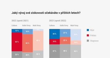 Tržby výrobních firem by se přes rekordní míru inflace měly letos zvýšit pouze o 4,1 %. Velké firmy jsou přitom ve svých odhadech o něco optimističtější než ty malé a střední (očekávaný růst tržeb o 4,7 % vs. 3,4 %). Pro oba segmenty to však znamená reálný pokles příjmů a zisků přibližně o desetinu.