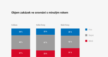 Polovina firem (49 %) zažívá aktuálně stagnaci, pokud jde o objem dojednaných zakázek. Více zakázek než ve stejném období předchozího roku má dojednaných jedna čtvrtina (24 %) společností a více než čtvrtina ředitelů (27 %) výrobních firem přiznala menší objem zakázek, než který mohli vykázat před rokem.