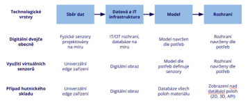 Implementace digitálního dvojčete obecně vyžaduje iterativní ladění všech technologických vrstev, každá iterace představuje velké náklady a čas, někdy i týdny na jednu změnu v senzorice nebo modelu. Místo toho, přístup virtuálních senzorů omezuje toto iterativní ladění pouze na vrstvu uživatelského rozhraní a instalaci virtuálních senzorů, která může trvat jednotky sekund a být provedena operátorem výroby. V tomto případu je model standardní, takže digitální dvojče skladu může být dodáno jako “plug&play”. InovecTech vyvinul unikátní technologii na efektivní instalaci a provoz virtuálních senzorů i unikátní SW pro agregaci dat z VS do celých trajektorií materiálu a mobilních zařízení (vývoj podpořen CzechInvest, i ve spolupráci s vědci z ČVUT), čímž umožňuje: