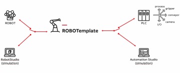 Zajímavou součástí řešení ROBOTemplate je tzv. digitální dvojče neboli nahrazení HW či jeho části digitálním modelem. Při vývoji tedy není nutné pracovat s fyzickým hardwarem. Je možné využít simulované platformy a s její pomocí navrhnout a naprogramovat řídicí software celé výrobní buňky. Současně i robot může být simulován v prostředí RobotStudio a lze tak vizualizovat celou buňku, odchytat možné kolize, navrhnout nástroje nebo odladit výrobní proces. Pro jednotlivé strany přitom není důležité, zda protistrana fyzicky existuje, nebo zda se jedná o simulaci.