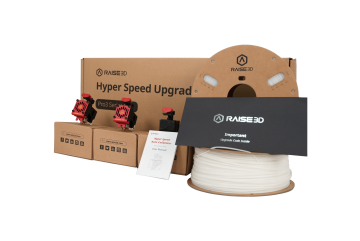 Pro tisk Hyper Speed FFF na 3D tiskárnách řady Raise3D Pro3 je k dispozici speciální kit, který obsahuje vše nezbytné – dvojici vysokorychlostních trysek, kalibrační sondu, klíč pro aktualizaci firmware a dvojici vysokorychlostních filamentů (ABS, PLA).