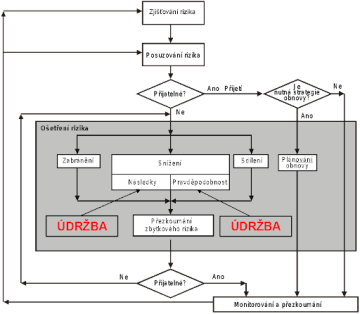 - K ošetřování (snižování) rizik přispívá zvláště preventivní údržba tím, že snižuje pravděpodobnost nebezpečných události (kritických poruch) a obecné činnosti údržby mohou přispět zálohováním rovněž ke snížení pravděpodobnosti poruch a dále různými opatřeními (např. montáží zábran, krytů, zádržných nádrží apod.) ke snížení následků rizik.