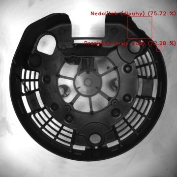 Na rám lisu byly nainstalovány 2 kamery s 360° objektivem na snímání dutin. Pro analýzu byly natrénovány neuronové sítě řešící rozdílné úlohy, a to detekci přetoků, malých nedotečení (<1 mm), velkých nedotečení (>1 mm) a chybějících žeber. Sítě běží na edge computeru s GPU Nvidia. Komunikaci se strojem zajišťuje PLC Siemens.