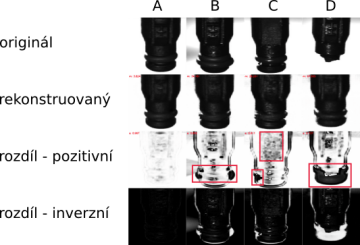 Červeně jsou vyznačené oblasti, které jsou významně odlišné od etalonu a mohou představovat vady.